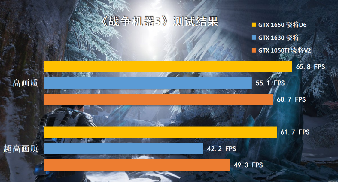 《战争机器5》基准测试,将画质设超高时,开启测试,1050Ti 骁将V2、1630 骁将、1650 骁将D6三张显卡的游戏平均帧率分别为49.3FPS、42.2FPS、61.7FPS。保持分辨率不变,只将画质降为高,三张显卡的游戏平均帧率分别为60.7FPS、55.1FSP、65.8FPS;