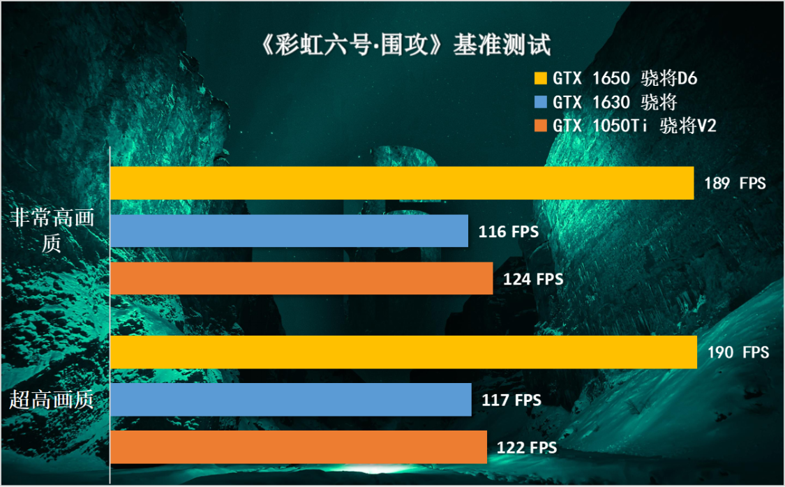 《彩虹六号·围攻》基准测试,将画质设为超高,1050Ti 骁将V2、1630 骁将、1650 骁将D6这三张显卡的游戏平均帧率分别为122FPS、117FPS、190FPS。保持分辨率不变,只将画质降为非常高,三张显卡的游戏平均帧率分别为124FPS、116FPS、189FPS;