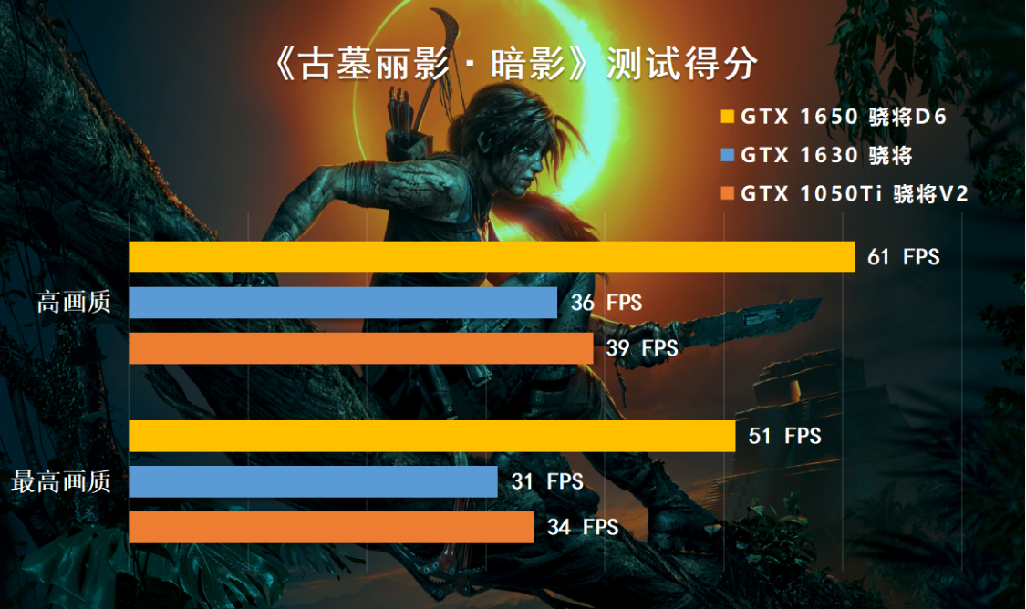 《古墓丽影·暗影》基准测试,将画质设为最高时,1050Ti 骁将V2、1630 骁将、1650 骁将D6这三张显卡的游戏平均帧率分别为:34FPS、31FPS、351FPS。保持分辨率不变,只将画质降为高画质,三张显卡的游戏平均帧率分别为39FPS、36FPS、61FPS;