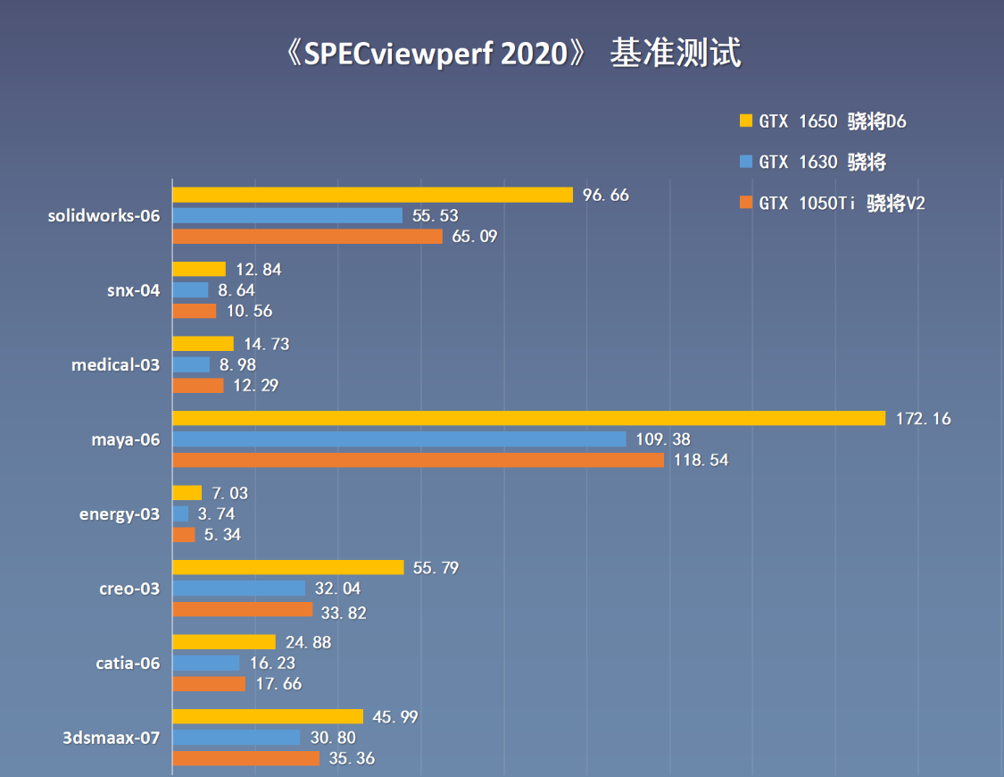 使用SPECviewperf 2020 对这三张显卡进行生产力相关测试,从下图可以得出结论,更大的显存位宽与更高的显存频率在从事生产力方面的创作时,也更具有优势;