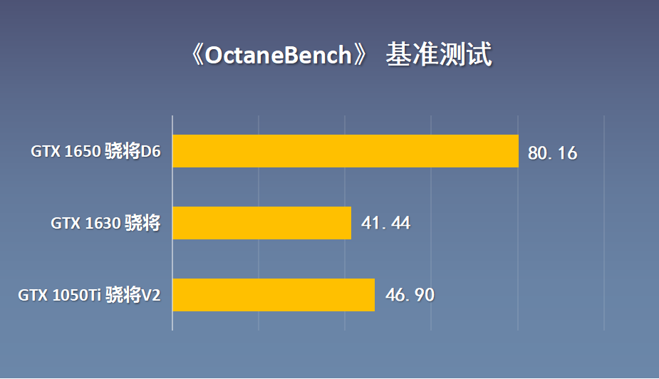 OctaneBench渲染性能基准测试,1050Ti骁将V2 得分46.90分,1630骁将得分41.44分,1650骁将 D6得分80.16分;