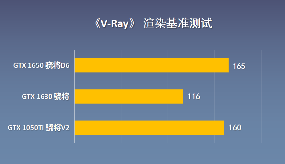 在V—ray的CUDA渲染速度基准测试中,1050Ti 骁将V2 得分160分,1630骁将得分116分,1650骁将D6 得分165分;