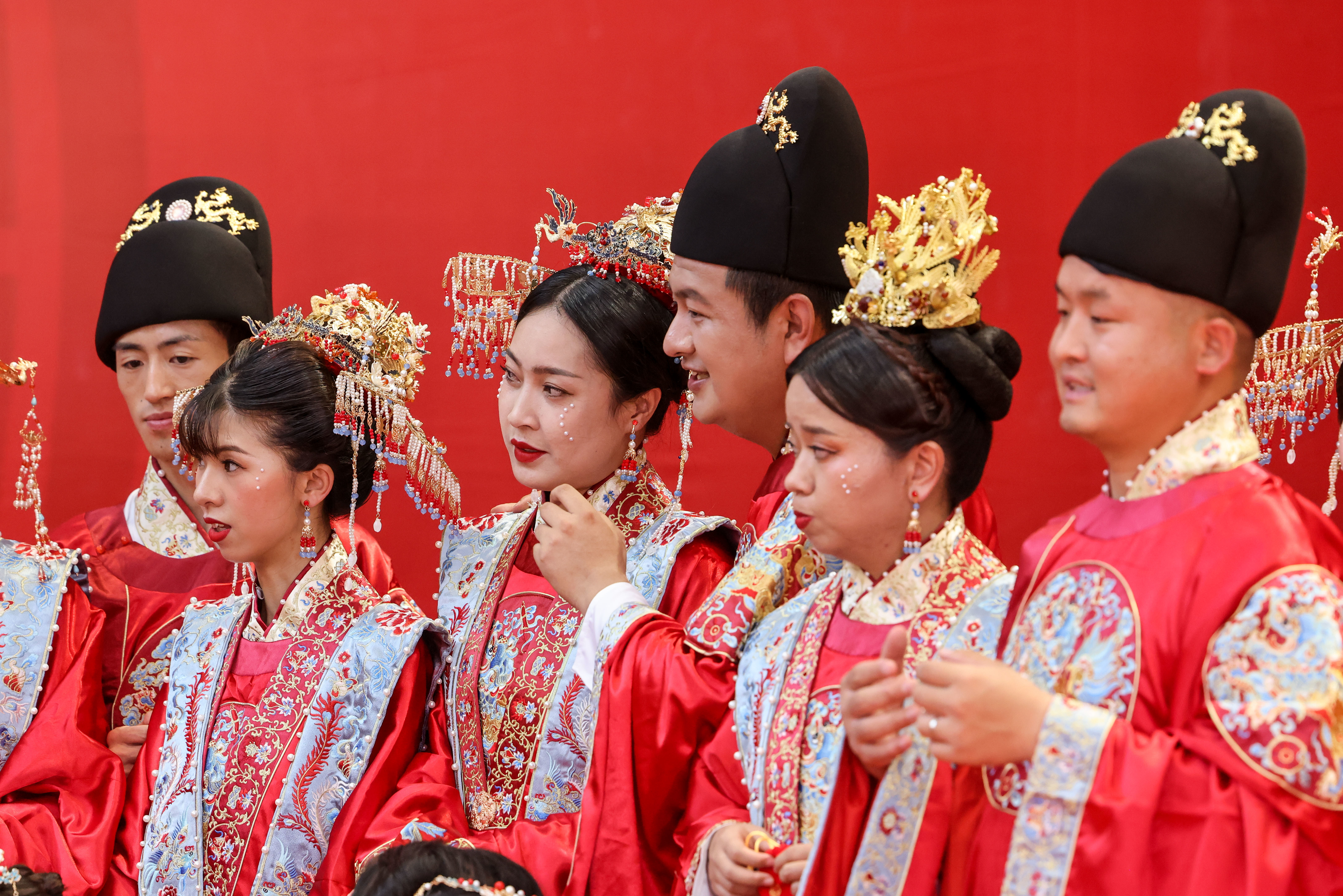 当日是七夕,2022(壬寅)年贵阳孔学堂中华婚礼在贵阳孔学堂举办,12对新人身穿中式婚服通过合卺礼、解缨结发、共书婚帖等方式完成传统婚礼仪式。