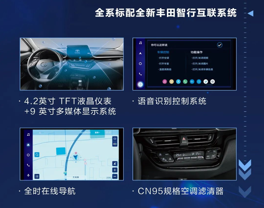 此外,在安全配置上,奕泽IZOA除了配备刹车防抱死(ABS)、LED日间行车灯、刹车辅助(EBA/BAS等)、制动力分配(EBD)、牵引力控制(ASR/TCS等)主驾驶安全气囊、副驾驶位安全气囊、膝部气囊等,全系还标配了“丰田智行互联”系统,在保证用户安全的同时,进一步提升了整车的科技感。