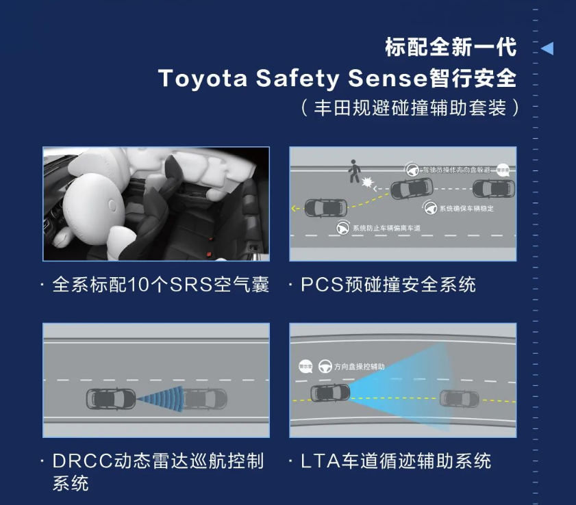 同时,奕泽IZOA配备了高强度低重心车身,ACA主动转向辅助系统以及前麦弗逊式独立悬架+后双叉臂式独立悬架组成的“四轮独悬”,让新车拥有较高的操控性与舒适性。加上全系标配了高达19个SRA空气囊与新一代Toyota Safety Sense智行安全,可以为每一位乘客保驾护航。