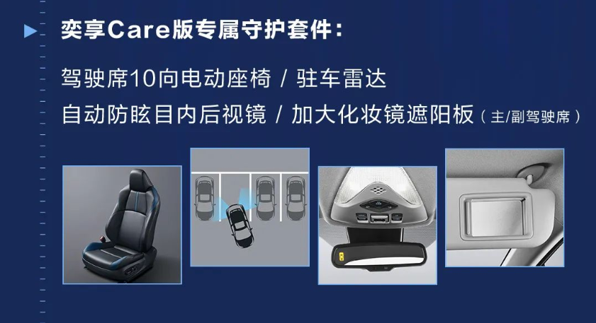 内饰方面,奕享CARE版与运动SPORT版均以钻石为设计主题,呈现出时尚的设计风格;奕享CARE版在2.0L汽油奕享版的基础上,配备了黑*蓝双色拼接的皮质座椅,同时还升级了驾驶席10向电动调节、驻车雷达、自动防眩目内后视镜等配置。值得一提的是,奕享CARE版还加大了化妆镜的遮阳板,让女生可随时随地的在线补妆。
