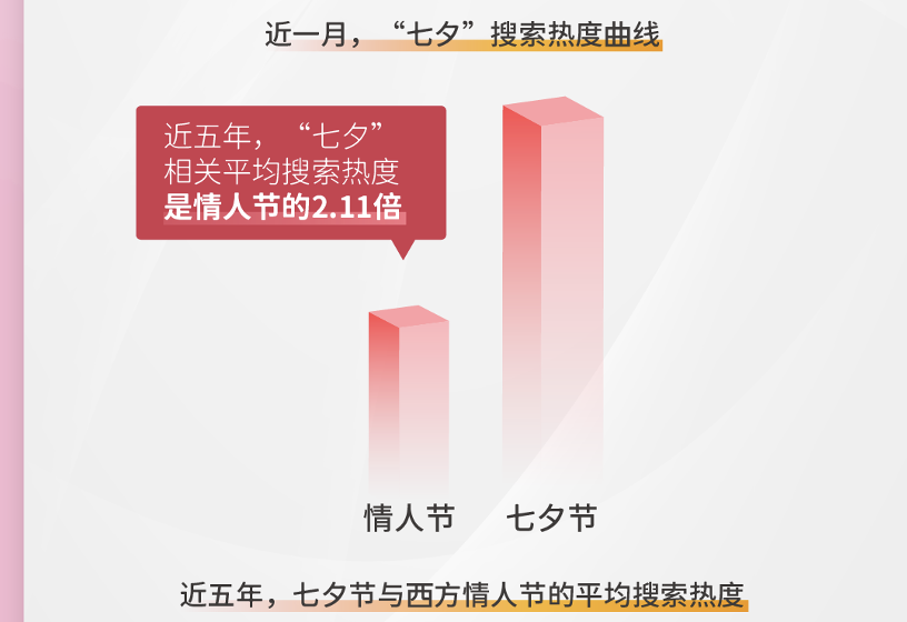 作为历史长河中经历“大浪淘沙”却依旧留存至今的节日,七夕对于国人的影响甚至远超西方节日。根据百度大数据日前发布的“七夕消费搜索大数据”中显示,五年间,“七夕”相关内容平均搜索热度是“情人节”的2.11倍。可见,国人对于“本土情人节”有着更多的关注。