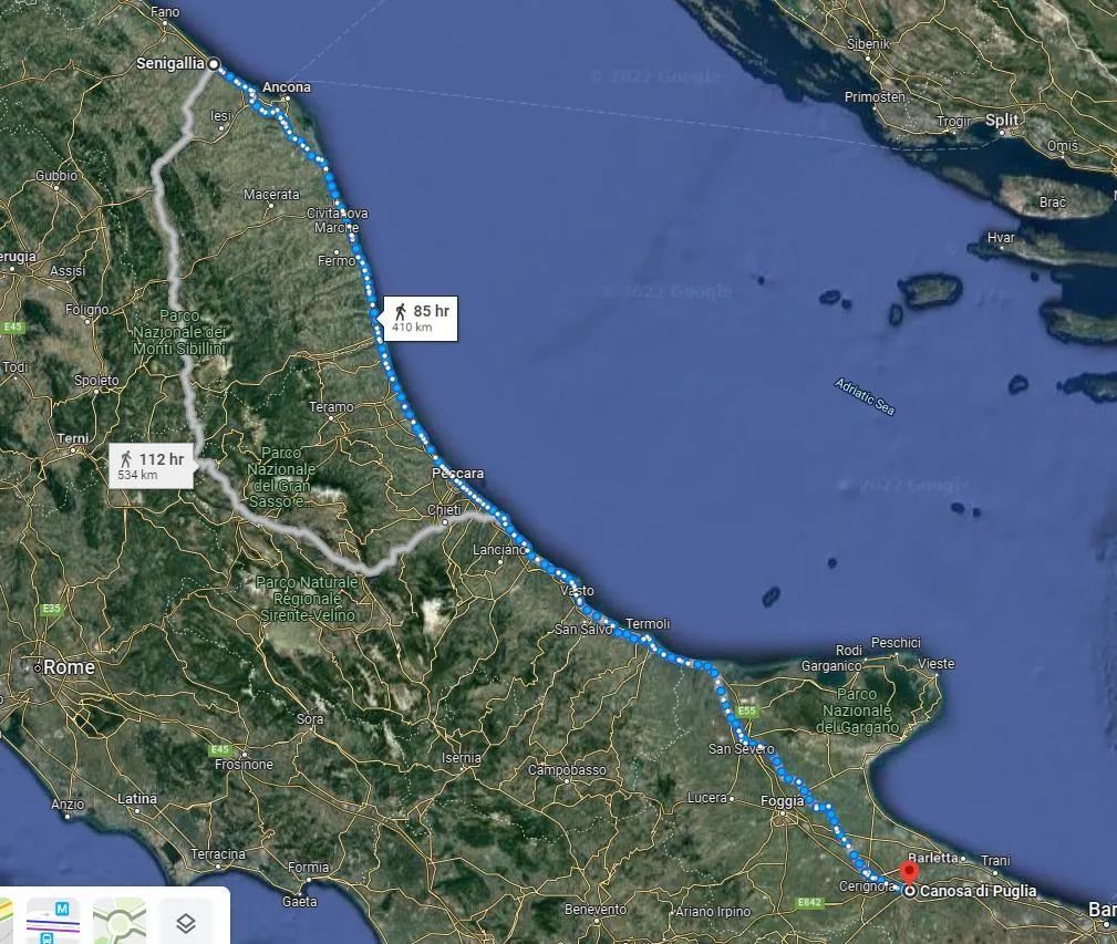 如此行军六天六夜后,尼禄“在六个白昼里从意大利的一端赶赴另一端”,也就是从时人概念里意大利南部的卡努西翁(Canusium,今意大利普利亚区卡诺萨)抵达意大利北端的高卢塞纳(Sena Gallica,今意大利塞尼加利亚):当时的意大利概念比现在的意大利共和国小不少,现代意大利的核心地带波河流域在那个年头还是“山南高卢”。
