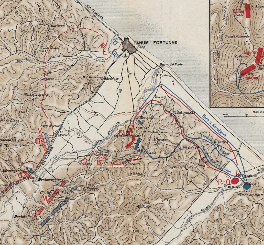 首先得简要介绍一下本次强行军的背景:公元前207年,迦太基名将汉尼拔之弟哈斯德鲁巴在春季率军翻越阿尔卑斯山,而后攻入意大利境内,企图与其兄长会师。机缘巧合之下,原本正与汉尼拔在南意大利对峙的执政官尼禄抓获了哈斯德鲁巴派往汉尼拔所在地的信使,一番拷问之下获得其行军计划。随即决心打破两位执政官各管一片的惯例,立刻抽调精锐北上,与另一执政官李维乌斯合兵一处歼灭哈斯德鲁巴。