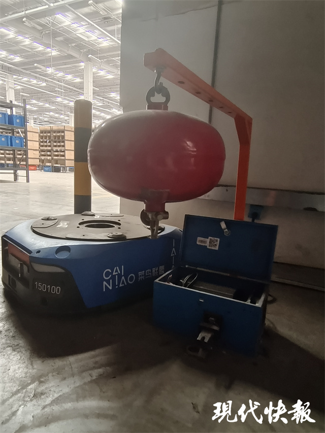 同样是高科技,在亚太地区最大的仓储物流企业无锡传云物联网有限公司(菜鸟物流)园区内,记者看到了数百台或工作或充电的“小蓝人”机器人,它们可以自主分配物流、寻找商品。采访中记者了解到,由于园区内物品种类繁杂、可燃易燃物数量多,消防部门对其有严格的防火要求。值得一提的是,由于“小蓝人”使用的都是锂电池,电量耗尽后会在仓库内自主充电,因此保证充电安全、预防爆炸爆燃就成了消防安全管理中的一个重要环节。在现场,记者看到就在机器人充电器的上方,摆放了一个类似球状的悬挂式灭火器材。“这叫干粉灭火弹,其下方管道内有一个气体测温防火装置,一旦感应到周边温度超过65℃,就会瞬间爆炸,扑救的同时可以防止火势蔓延。”无锡消防工作人员告诉记者,通过巧妙使用高科技防火器材,可以从源头对机器人充电进行防护,预防火灾事故的发生。