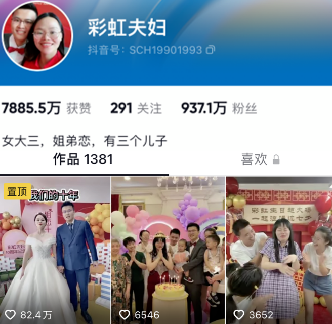 蝉妈妈数据显示,目前彩虹夫妇抖音粉丝936.7万。