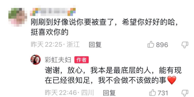 昨天晚上,彩虹夫妇也是疑似回应说:“我本是最底层的人,有现在很知足,我不会做不该做的事”。