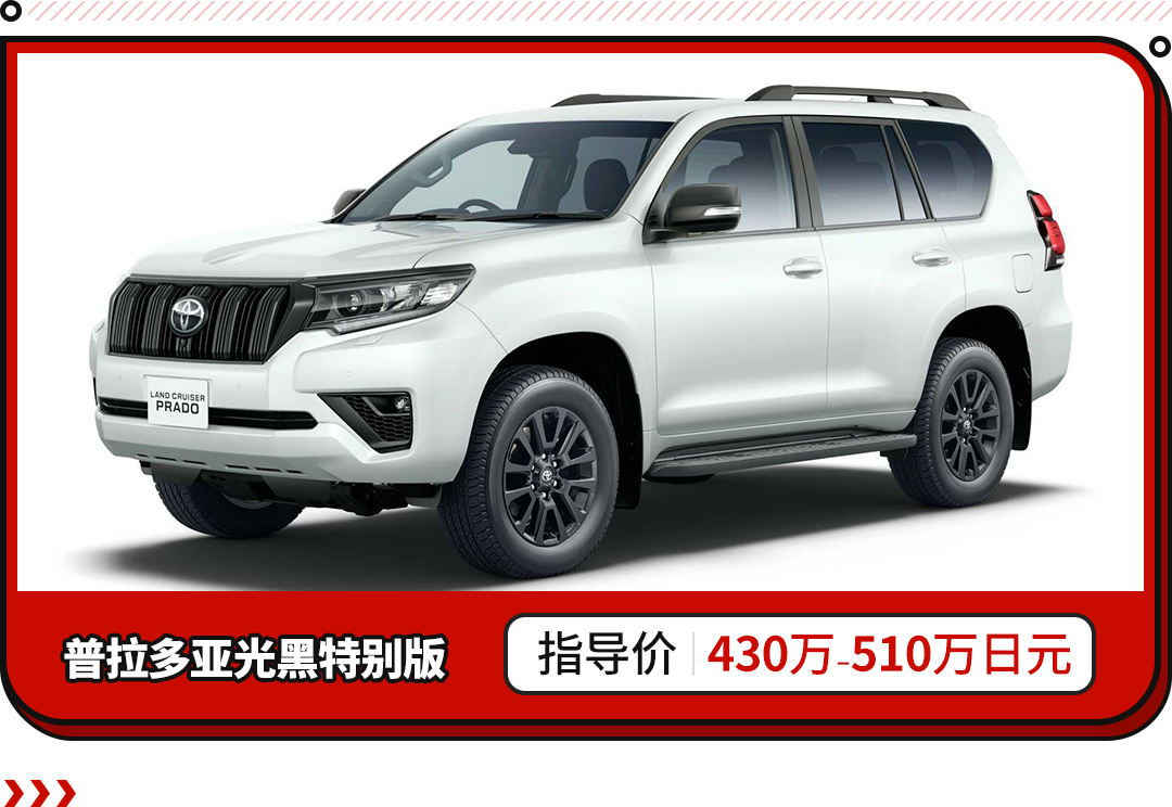 近日,有外媒报道表示,在日本本土市场推出一款带有哑光黑配色的丰田普拉多车型,命名为Land Cruiser Prado Matte Black Edition。新车的指导售价区间为430万-510万日元(约合人民币22万-26万元)。这是继去年推出的70周年纪念版之后,又一款新的力作。