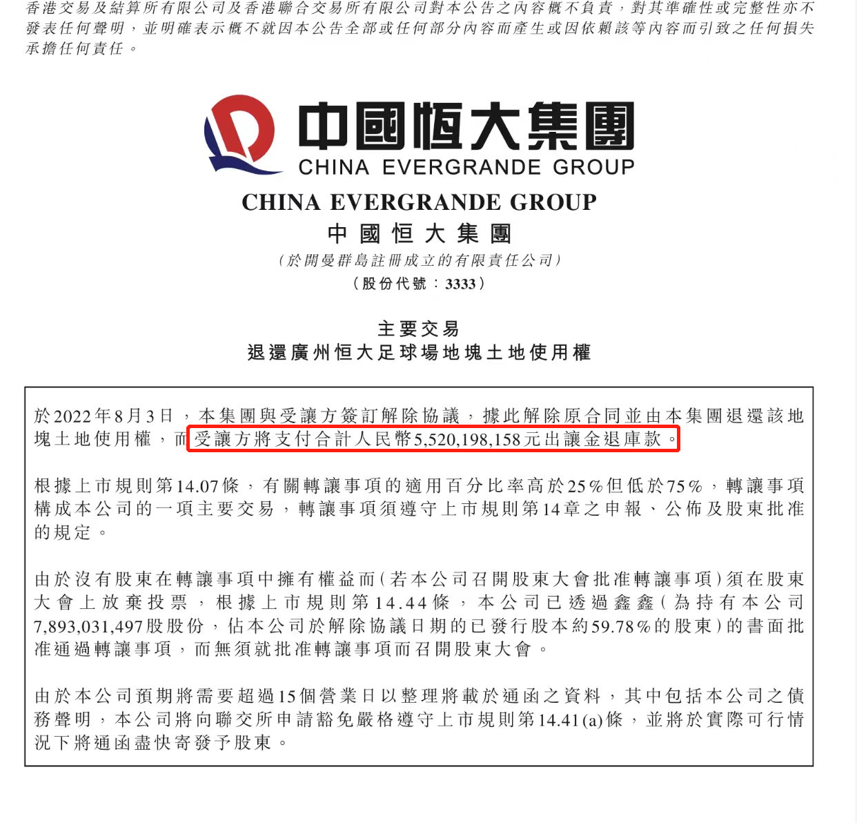 8月4日晚,中国恒大公告称,公司退还了广州恒大足球场地块使用权。于8月3日与受让方签订解除协议,恒大退还该土地的使用权,而受让方广州市规划和自然资源局将支付合计55.2亿元出让金退库款。该笔款项将由受让方支付至政府指定的专项监管账户。