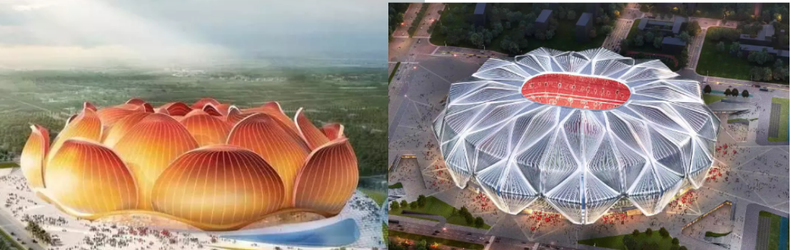 许家印亲自参与设计,还邀请了来自美国、德国、英国、澳大利亚等国家的8位顶级设计大师,先后设计了数十个涉及方案。最开始官宣的造型是一朵金红色的大莲花,设计图一出,纷纷被网友吐槽“太丑”,之后又重新设计方案,据说设计灵感来源于“并蒂莲”,但相比之前的莲花,新造型更像一颗“宝石”。
