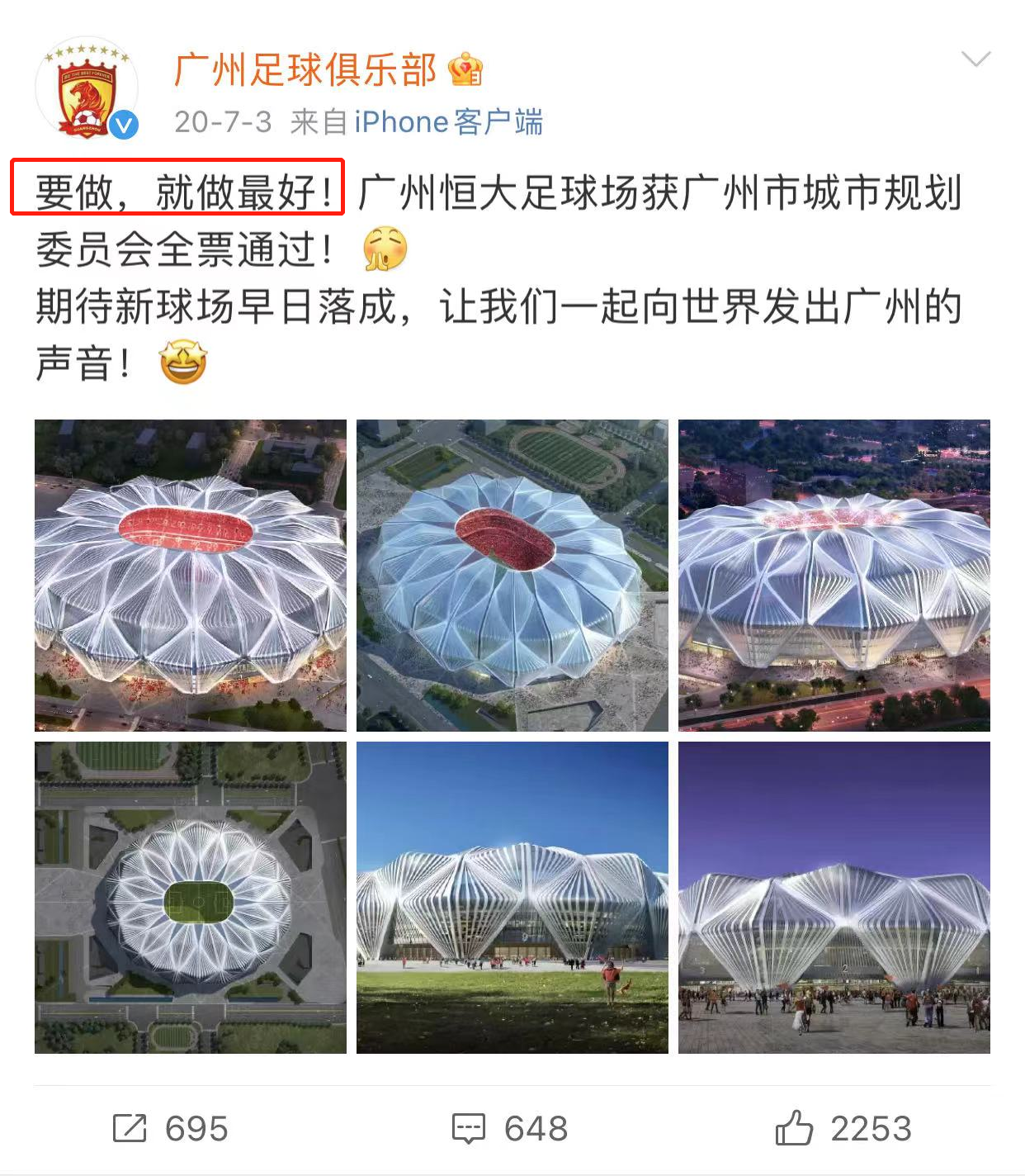官宣新造型时,广州恒大足球俱乐部官微还附文:“要做,就做最好!”并表示期待新球场早日罗成,一起向世界发出广州的声音。