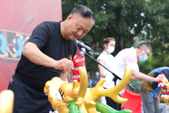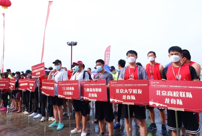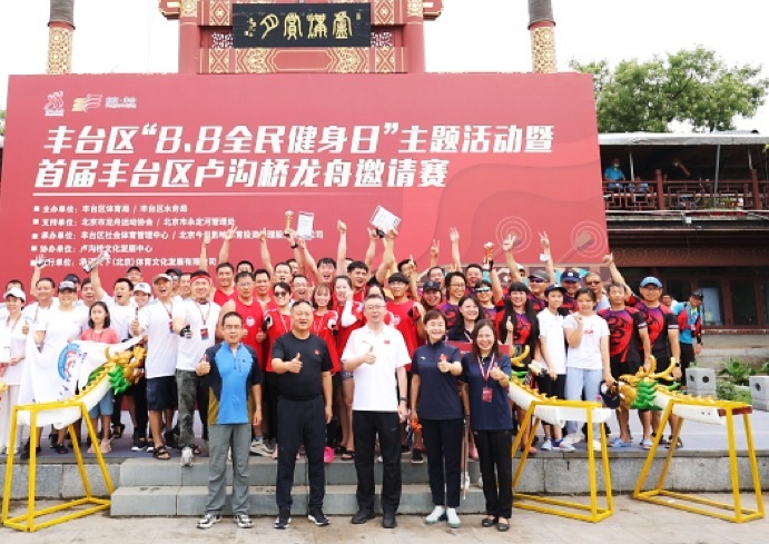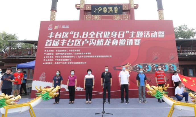 8月7日,丰台区“8.8全民健身日”主题活动暨首届丰台区卢沟桥龙舟邀请赛在北京卢沟桥晓月湖公园隆重举行。早上八时许,签到处人头攒动,参赛选手积极配合出示身份证、健康码、行程码,领取背包、帽子等参赛用品后有序入场。本次赛事由丰台区体育局、丰台区水务局主办,在北京市龙舟运动协会、北京市永定河管理处的支持下,丰台区社会体育管理中心与北京今日影响体育投资管理股份有限公司联合承办,承泽天下(北京)体育文化发展有限公司执行。本届赛事共有来自北京市直机关、企事业单位、高校的12支代表队近两百名选手参赛,选手们来自各行各业、覆盖各个年龄层;12支赛队分别是北京公羊会龙舟队 、北京联通公客中心龙舟队 、纳通龙舟队、T13龙舟队(北农队)、北京高校联队龙舟队、右安门体协龙舟队、北京市冬泳俱乐部龙舟队 、北京大学校友龙舟队、S奥森夜跑团龙舟队、玉渊锦鲤龙舟队、影视联盟龙舟队 、小小外交官龙舟队。经过前一周的试水和积极训练,选们纷纷摩拳擦掌,各龙舟队蓄势待发。上午九时开幕式正式举行,北京市永定河管理处、丰台区水务局、丰台区体育局、宛平街道办事处、卢沟桥文化发展中心、北京市龙舟运动协会、北京今日影响体育投资管理股份有限公司等相关单位领导出席,在比赛开始前,举行传统的龙舟点睛仪式,随后大赛正式拉开帷幕。