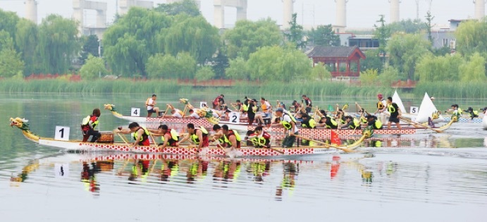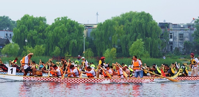 随着裁判员一声令下,伴随着铿锵激昂的鼓点,A组的6支龙舟队伍疾速前行,晓月湖上碧波荡漾,锣鼓声中龙舟奋楫,劈波斩浪;霎时,呐喊助威声、鼓点、口号声,汇集成激昂的赛场主旋律,水面、岸边声浪交织,气氛高涨,彰显着新时代“龙的传人”拼搏进取的精气神。