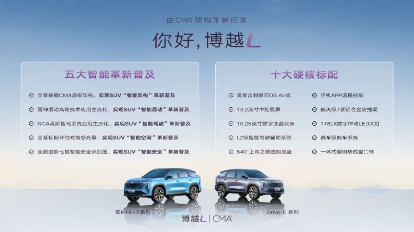 借助五大世界一流智能科技,博越L实现五大核心领域的革新普及,并以首发吉利银河OS Air版、13.2英寸中控竖屏、10.25英寸数字液晶仪表、L2级智能驾驶辅助系统、540°上帝之眼透明底盘、手机APP远程控制、航天级7系铝合金防撞梁、178LX数字律动LED大灯、赛车级刹车系统和一体式硼钢热成型门环这“十大硬核标配”,确立起核心领先优势,重新定义了智能SUV市场的准入标准。
