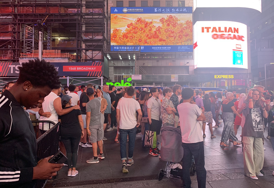 纽约当地时间8月4日早晨6时,在被誉为“世界十字路口”的纽约时代广场上,各种肤色的游客川流不息。汉字、黄河、牡丹、宝塔山……醒目的中国元素引得人们纷纷驻足观看。从此经过的华人华侨、中国留学生,看到广场大屏上的中国符号,倍觉亲切。在同一块显示屏上,来自中国的原生态乡土艺术与各种洋品牌广告轮番播放,给人以时空穿越之感。
