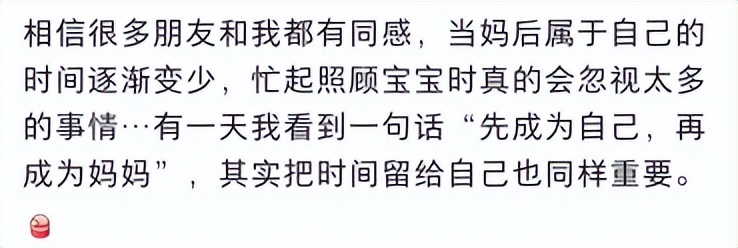 她还配文感慨自己自从当了妈妈后就很少有属于自己的时间了,照顾孩子会忽视很多事情。有一天她看到这么一句话“先成为自己,再成为妈妈”,这句话带给她很多启发,她表示其实把时间留给自己同样重要。