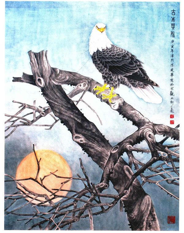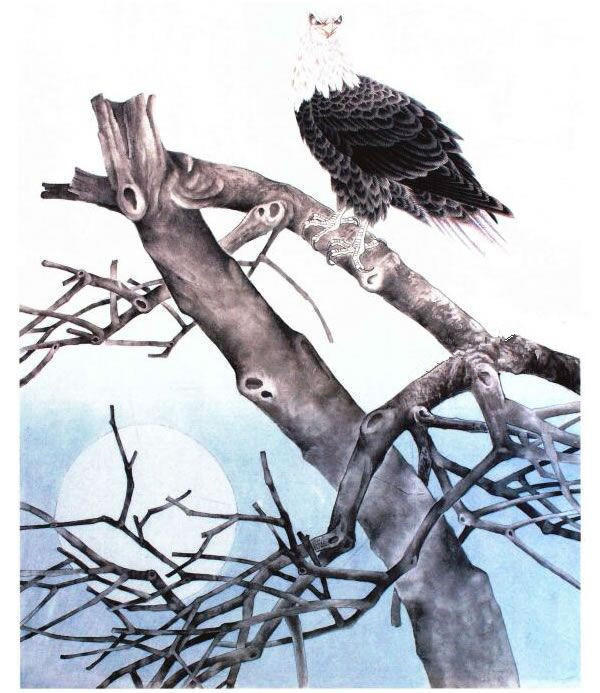 这里所描绘的是一种名叫白尾海雕的大型猛禽,它们主要栖息在海岸和湖泊、沼泽附近的树上,以捕食鱼类为主要食物。体型较大,雄雌同色,头和尾呈白色,嘴、眼、趾爪为黄色,通身呈黑色并闪有紫色光,样子十分好看。创作动机:主要表现旭曰刚刚升起,一只海雕屹立在古老的枯树上,准备飞向空中翱翔。寓意“一日之计在于晨,一年之计在于春”的努力奋斗方向和美好愿望。