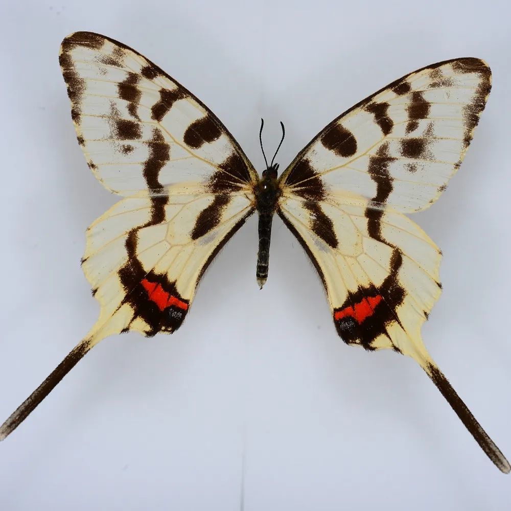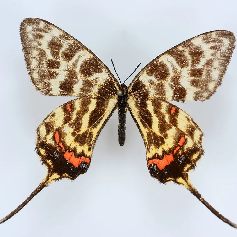 后翅尾突如此长者只有丝带凤蝶,但画中蝶前翅似雄蝶,后翅似雌蝶。