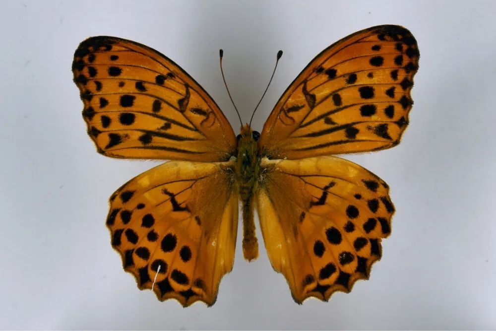 画中左侧的蝴蝶,不论从触角、翅型或斑纹,均符合蛱蝶科豹蛱蝶群的特征。但右侧的鳞翅目昆虫,触角特征是蝴蝶的棒状,翅型与斑纹等特性却极像蛾类。
