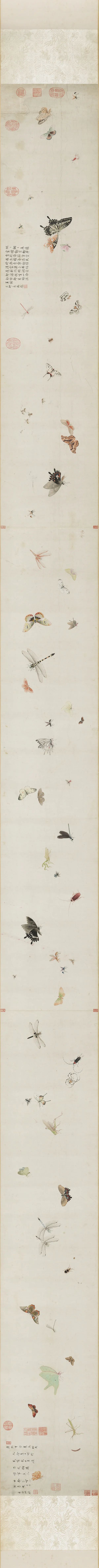 朱汝琳画这件手卷时,只是十几岁的青少年。不过他的笔力细健,色彩雅洁,描绘了蝴蝶、蜜蜂、天牛、蚱蜢、螳螂、蚂蚁等等,最有趣的是还有一只蟑螂。这件作品留白处,原本是要给友朋针对这些昆虫分别题诗,可惜后来作品进献宫中,只留下乾隆题写的一首诗。