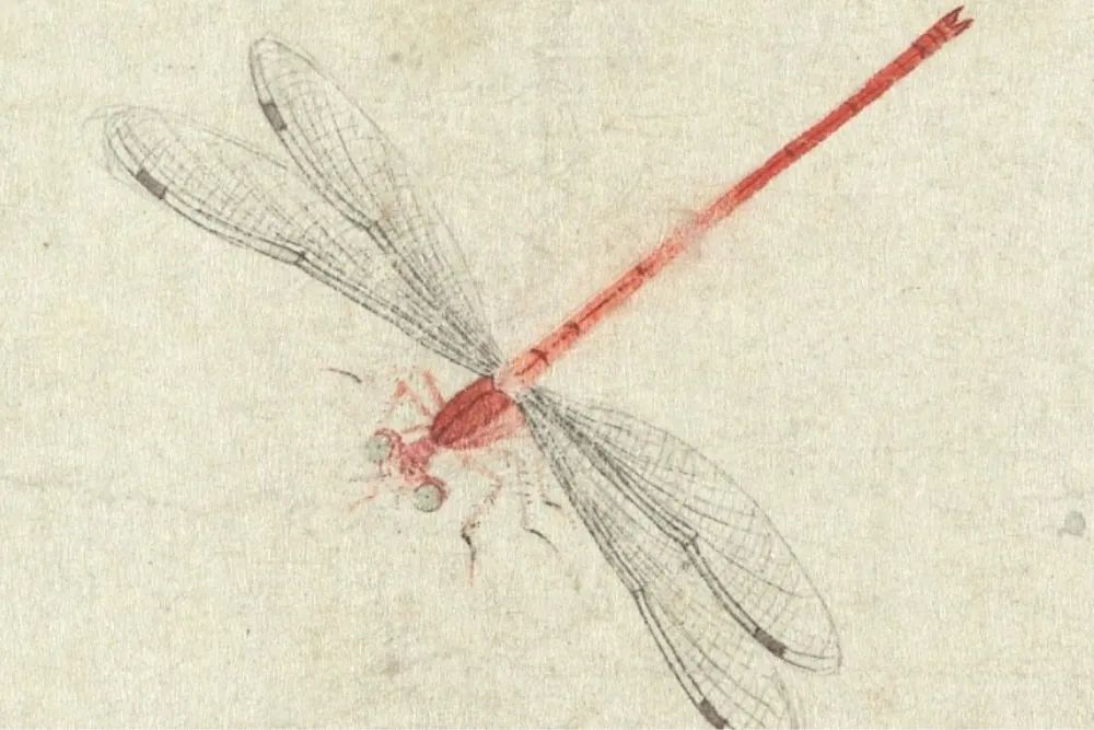 由画中蜻蜓双翅的姿势与展开角度,我们可以判定作者作画时观察的是一只正处于休息状态(停栖中)的蜻蜓。