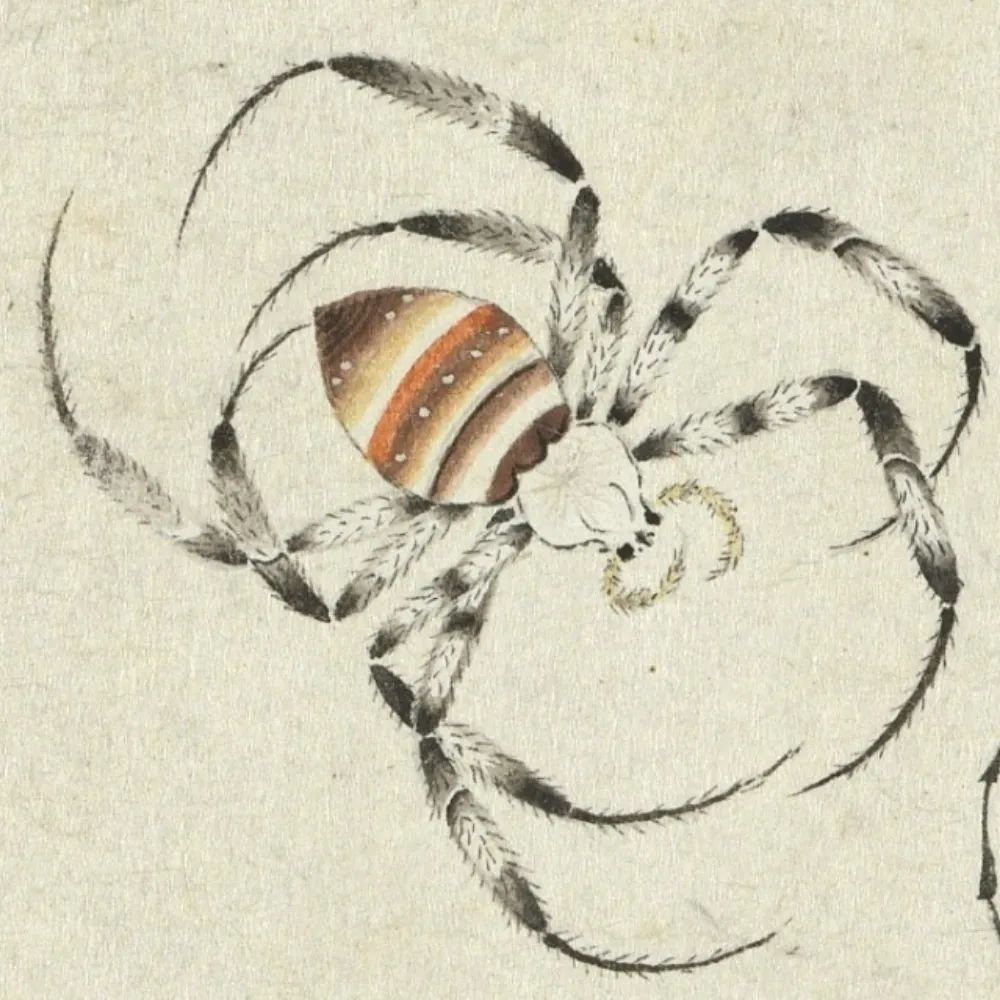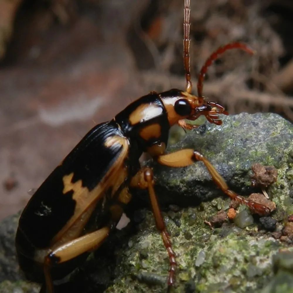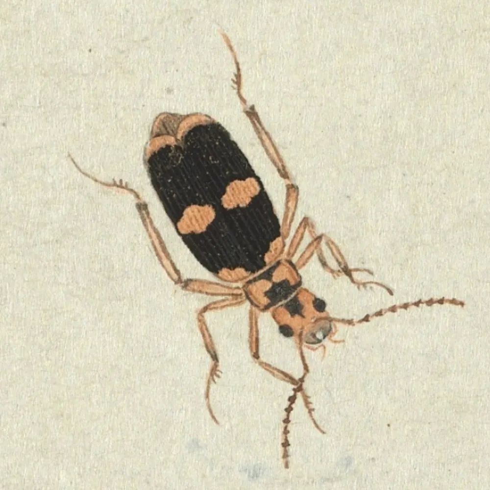 长尾炮步甲虫 (Pheropsophus occipitalis) 分布于东亚地区,古画内所绘特征与目前野外个体形态非常相似,也呈现出快速爬行前往猎捕右下角昆虫的取食行为。它们通常白天隐匿土表枯落叶下,夜间出来觅食。