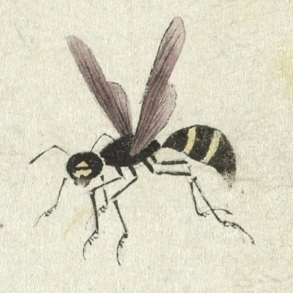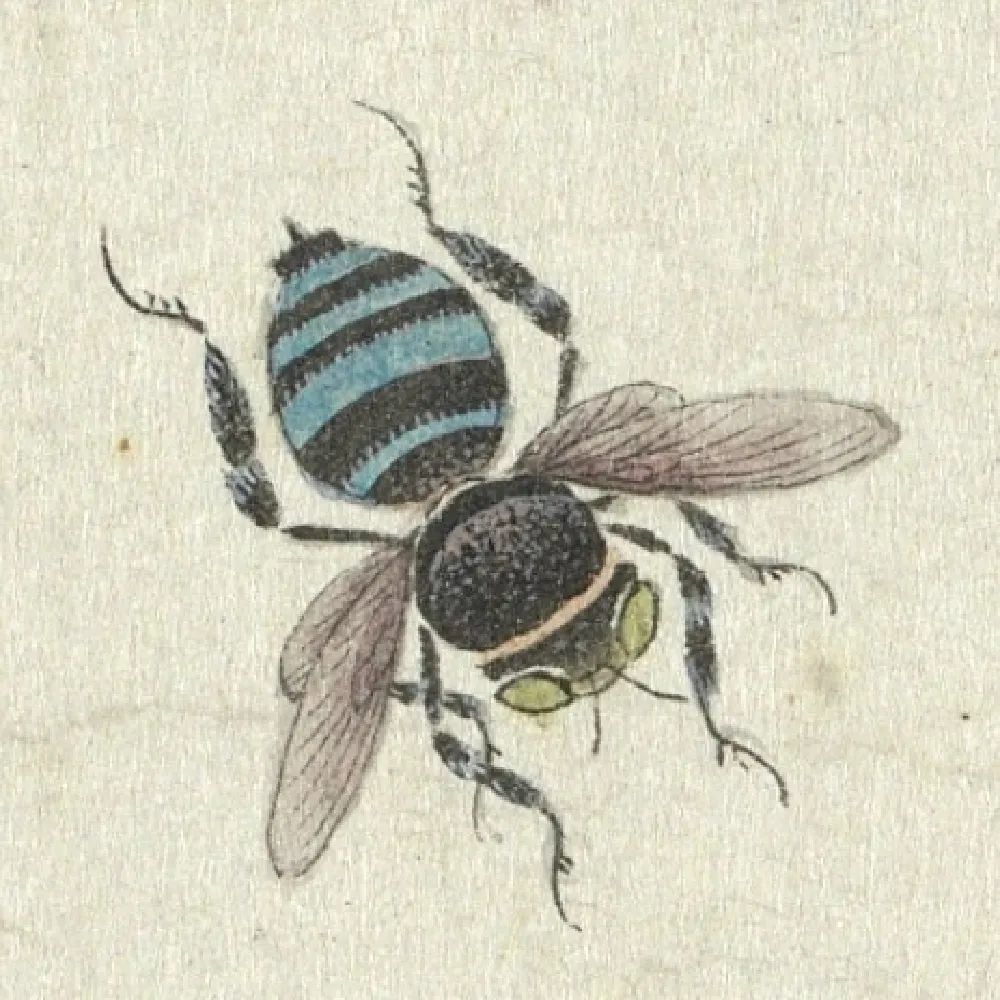 画中这只蜂的体色主要为黑色,腹部具有蓝色条带,后足胫节膨大,复眼略带绿色,依据上述特征及体态,推测可能是在描绘膜翅目蜜蜂科条蜂族 (Anthophorini)的蜂类。条蜂族虽为独居性,但常与同类聚集筑巢,另外还有一点有趣的是,它在休息的时候会利用大颚咬住枝条像旗子一样悬在半空中。