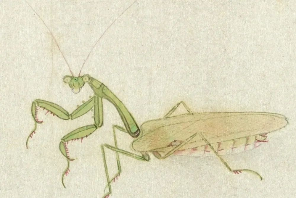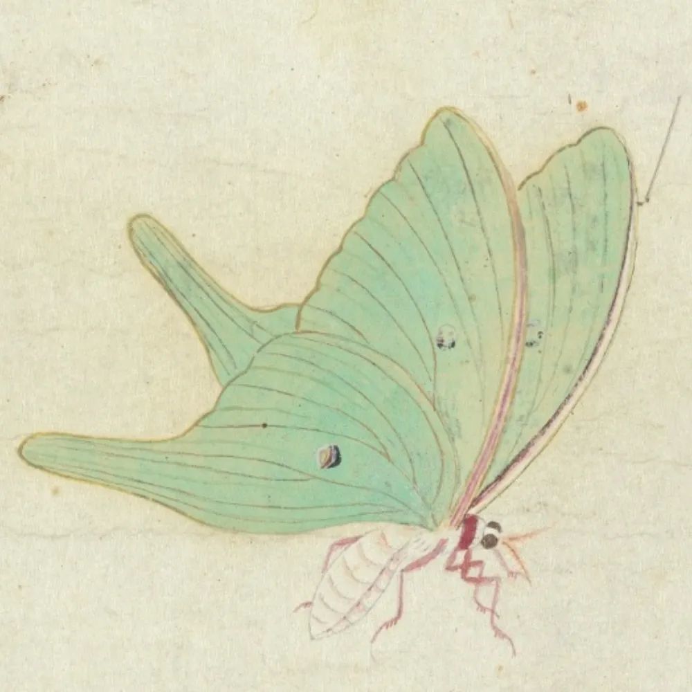 朱汝琳是观察实体后描绘这些草虫的。如卷末浅碧绿色的“长尾水青蛾”,前翅边缘的粉红色,或是绿色翅膀上眼型纹饰出现的黑、白、红弧形线条,都切中长尾水青蛾的特征,令人感受到他对这些微小生命的好奇与喜爱。这个画卷对草虫忠实的再现,让这件作品成为十八世纪初的一份珍贵的生物记录。