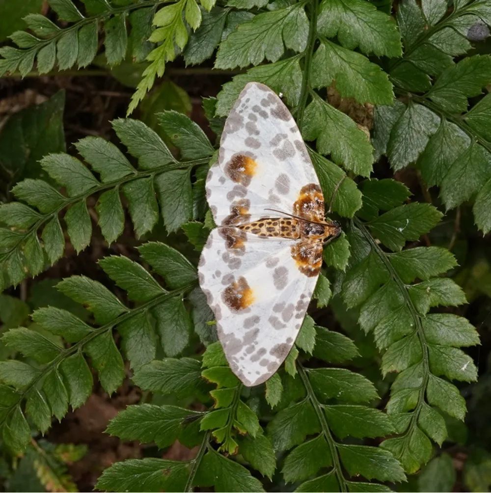此图不论从触角或斑纹特征都会推断为蛾类,且很可能为尺蛾科金星尺蛾属。属于中小型蛾类,身体黄色,背部有些黑色小色块,以乳白色为底的翅上,搭配有黑褐色和黄色的色块,配上小斑点缀其中,大多数种类其前翅臀角区具有大块的黄褐色斑点,与画中所绘相符。
