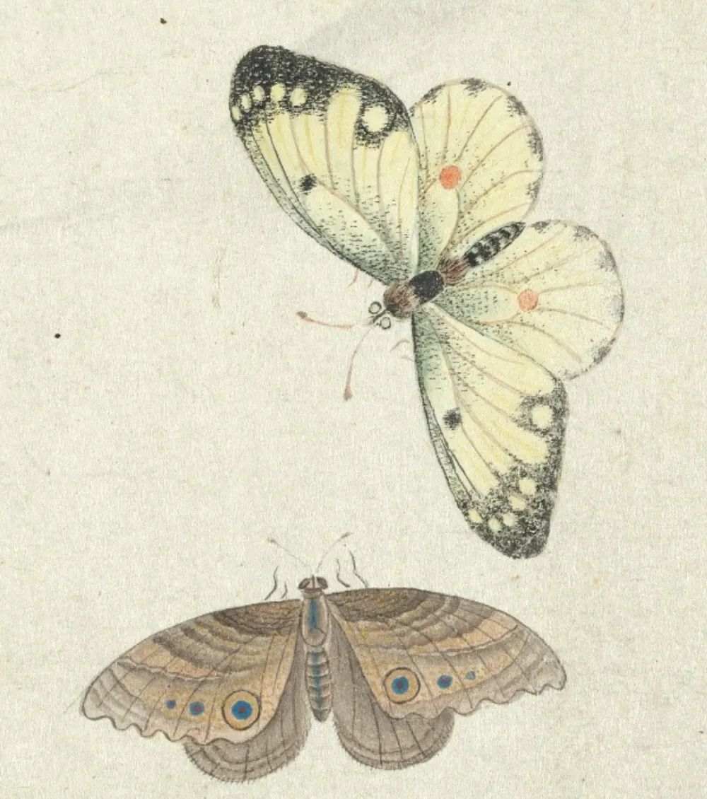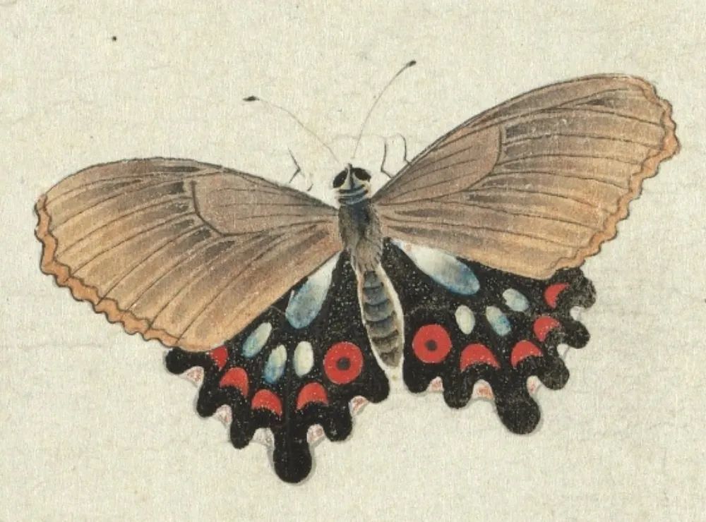 朱汝琳所绘这三只鳞翅目相当靠近,甚至互相重叠,但应不具特别生态意义!右上方体型较深的蝴蝶,不论是翅形、翅脉、尾突及斑纹等特征,都与现生的柑橘凤蝶接近;左上方覆盖凤蝶的则是一只蛱蝶,翅脉符合蛱蝶科特征且触角呈现细长笔直的棒状,在后翅具有小突起,而前后翅各一对眼纹,前翅眼纹深且较小,后翅眼纹偏粉色且大,前翅基部有一对对称的云纹状斑,判断应为蛱蝶科眼蛱蝶属的蝴蝶;至于左下方的小蝴蝶,依体型与背面色泽,或许是小灰蝶,但却是很艺术的呈现而难以科学判断,且触角为蛾类的丝状,因此也可能所绘者为蛾类!