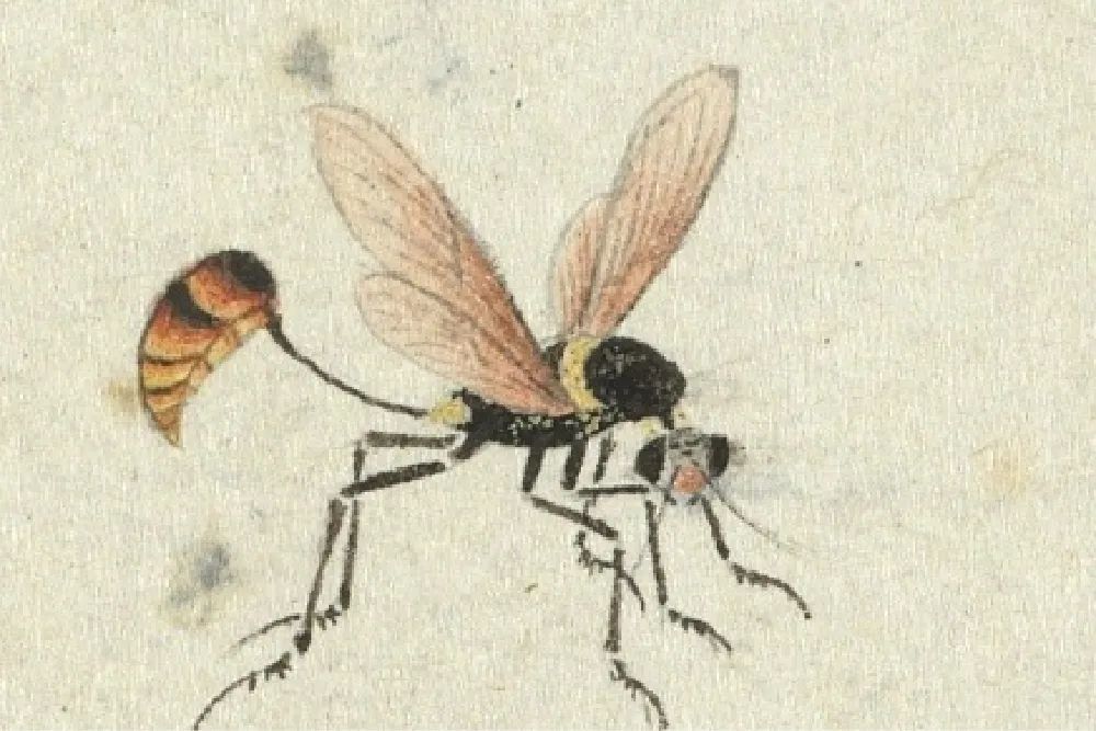 依据画中蜂的腹部有一细长管状构造,推测应为膜翅目细腰蜂科 (Sphecidae) 蜂类。
