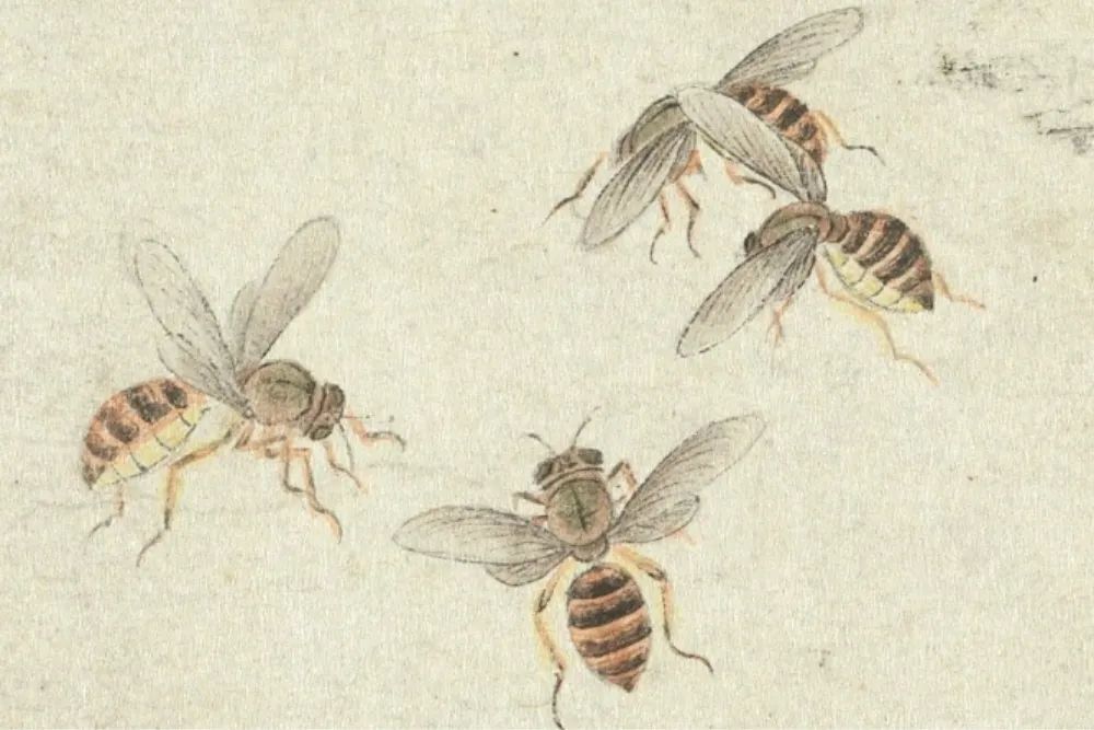 从画中蜂类胸部黑色具有黄色绒毛,以及腹部黄黑相间等特征,推断应为膜翅目蜜蜂科蜜蜂属(Apis)的蜜蜂。而此画作的蜜蜂物种存在两种可能性,其一为东方蜂 (A. cerana),其二为西方蜂(A. mellifera),两种蜜蜂之间差异在于后翅其中一个翅脉的有无,由于画作中的翅脉并非实际的样貌,因此无法再做更进一步的鉴定。