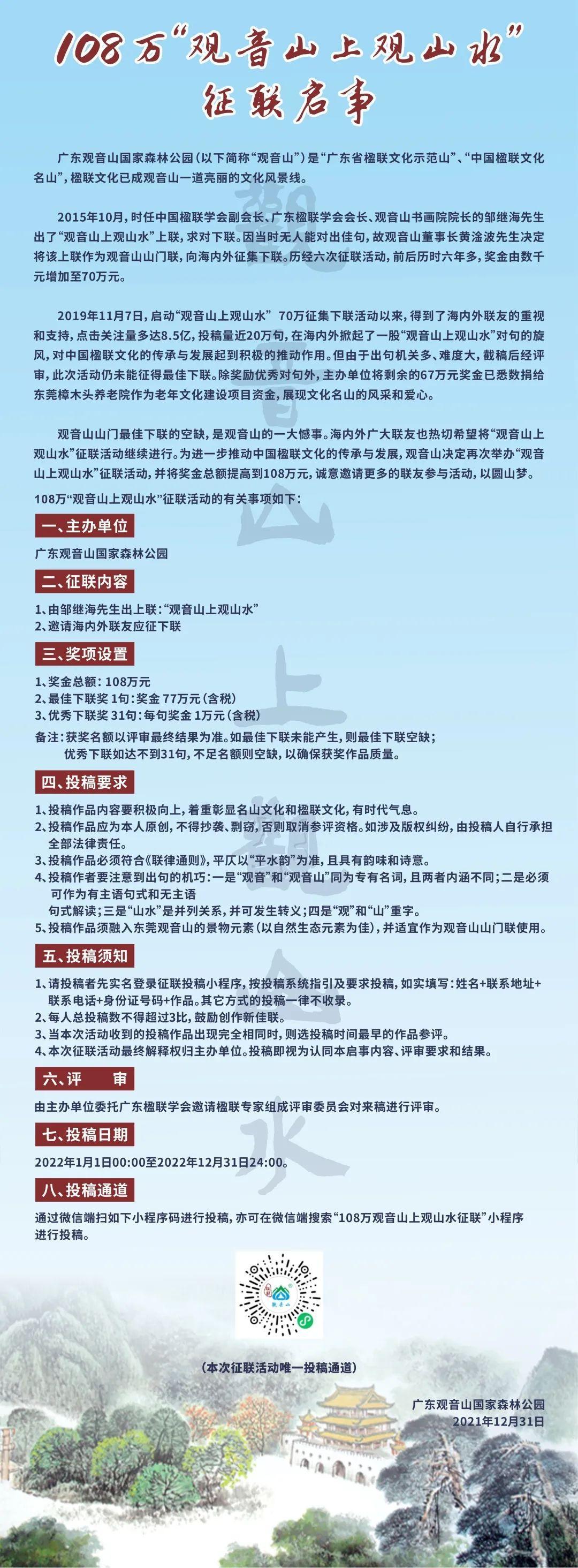 5、投稿作品须融入东莞观音山的景物元素(以自然生态元素为佳),并适宜作为观音山山门联使用。