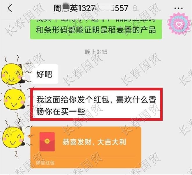 张先生介绍,发现香肠中有异物后,自己当天下午四点多联系了“稻麦香”客服0431-87992198,电话始却终无人接听。第二天十点再次拨打,接线员给了一个手机号让联系销售经理。电话接通后,销售周经理让张先生先加自己微信,一会再给回过来,张先生加了周经理微信后一直在等待消息。直到下午两点钟,周经理才联系他,把拍摄的产品视频发给周经理后,周经理又没了消息。晚上九点多,周经理再次联系到张先生,终于给出了处理方案,“我这面给你发个红包,喜欢什么香肠你再买一些。”稻麦香公司宣称以"生产健康、安全、良心的食品"作为企业的经营使命,努力创新和不断提高产品质量是企业永恒的宗旨,对于消费者反映的产品质量问题,竟然一句道歉的话都没有说,这样的处理态度实在不能令人信服。