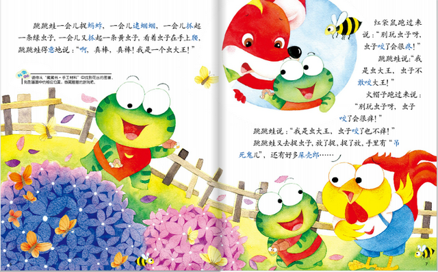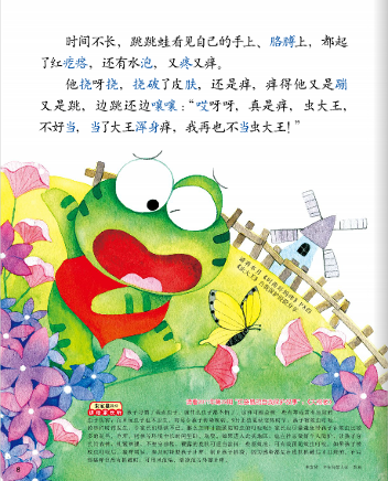 时间不长,跳跳蛙的手上、胳膊上都起了红疙瘩,又疼又痒,痒得他又是蹦又是跳,边跳还边嚷嚷:“虫大王,不好当,当了大王浑身痒,我再也不当虫大王!”