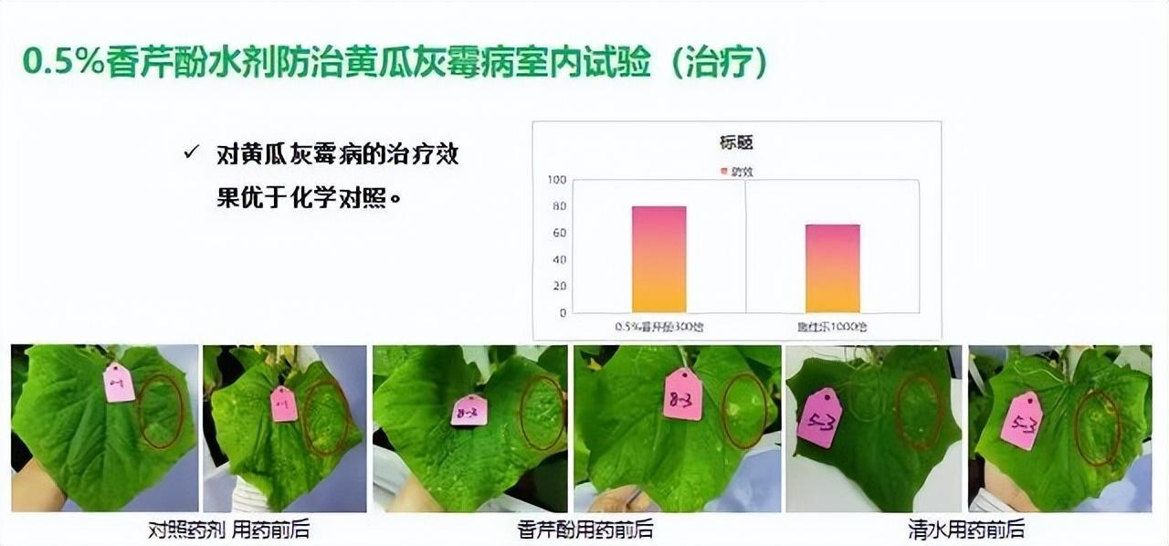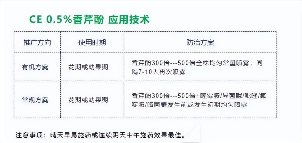 根据室内以及田间的药效试验结果显示, CE0.5%香芹酚水剂对果实、叶片均无不良影响,同时与化学农药搭配对作物也无不良影响。