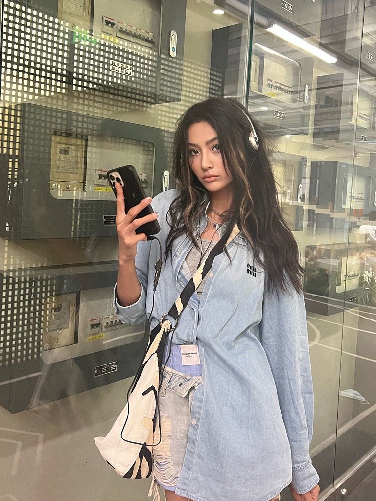 万籽麟拍摄街头风穿搭写真 牛仔衬衫裙造型时尚帅气