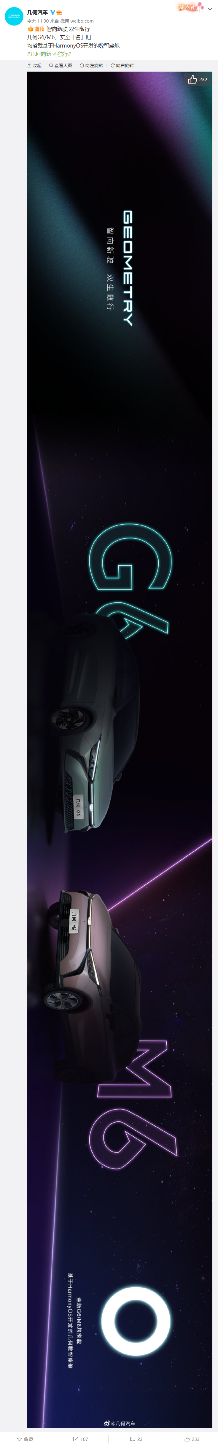 IT之家 8 月 8 日消息,日前,吉利旗下几何汽车公布了旗下两款全新车型 —— 几何 G6、几何 M6 官方图,从目前公布的信息来看,它们都将搭载基于华为鸿蒙 HarmonyOS 开发的数智座舱,售价预计在 20 万元以内。