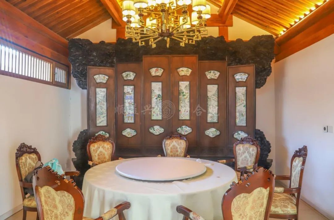 餐厅的墙面上,雕花若隐若现,犹如羞怯的少女那般犹抱琵琶半遮面。古典的桌椅家具融入了现代生活元素,简约的线条与复杂的纹饰完美结合、相得益彰。