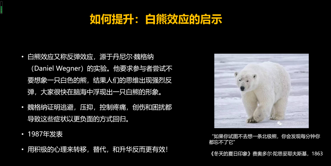 直到上世纪80年代,丹尼尔·魏格纳做了一个实验,要求参与者尝试不要想象一只白色的熊,结果人们的思维出现强烈反弹,大家很快在脑海中浮现出一只白熊的形象。魏格纳证明,逃避、压抑、控制人们的疼痛、创伤和困扰,都导致这些症状以更负面的方式回归;用积极的心理来转移、替代和升华反而更有效,这就是著名的“白熊效应”。