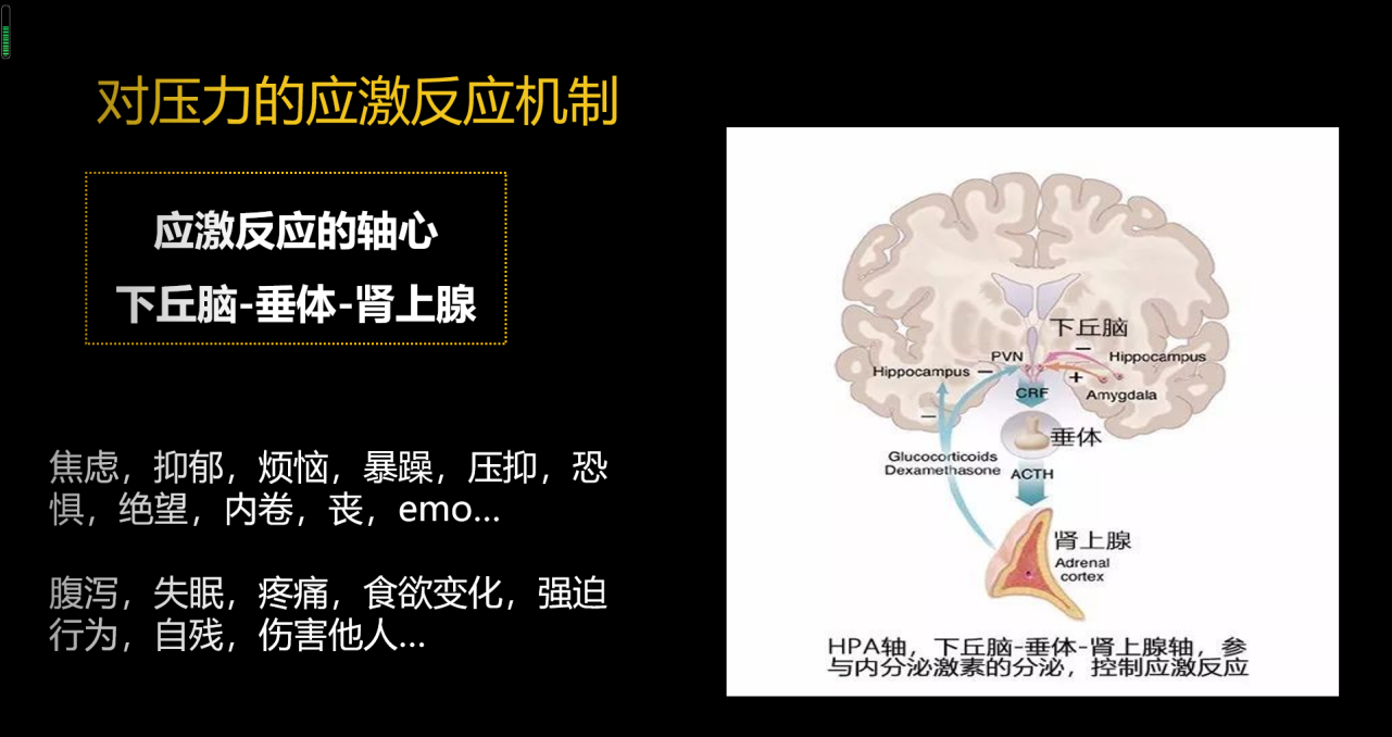 其中一个很重要的应对方法叫做应激反应,当我们遇到挫折、打击、失败、风险、死亡各种挑战的时候,人的身体会产生压力激素,这些激素会让我们耳朵更灵、眼睛更毒、感觉系统更敏锐,同时心跳加快,血液循环加速,肌肉力量、骨骼力量都变得特别强大,所有这一切会让我们进入到一种状态,能够斗,能够逃,能够跑,能够跳,这是一种应激反应的应激状态。
