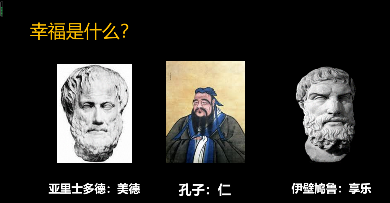 这个思想恰好跟亚里士多德的思想是一致的,亚里士多德认为一定是那些有美德的人他的快乐才是真正的幸福。这说明东西方文化虽然源头不同,但它达到的境界都是一样的,幸福一定不是简单的享乐,幸福是一些特殊人士才应该得到的一种心理体验。