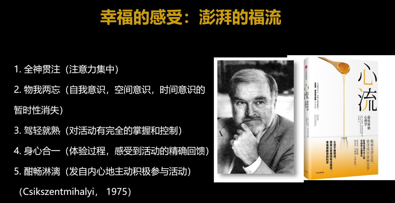 1975年这本书出版,后来中国心理学家把人类极致的幸福体验用了一个概念叫做“心流”。我回国之后决定把这个“心流”改译成“福流”?因为心流的状态我们古人早就描述过,比如做一件事情能够沉浸其中,全神贯注,以至于达到一种心无旁鹜的境界,自我意识、空间意识、时间意识暂时消失,物我两忘,做起来特别流畅特别顺,而且特别喜欢这个过程,这些体验和中国人说的庖丁解牛是不是完全一样?所以我把它翻译成“福流”是想赋予它更多的中国元素。