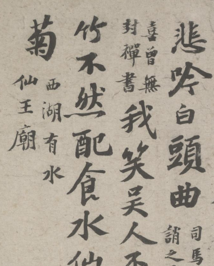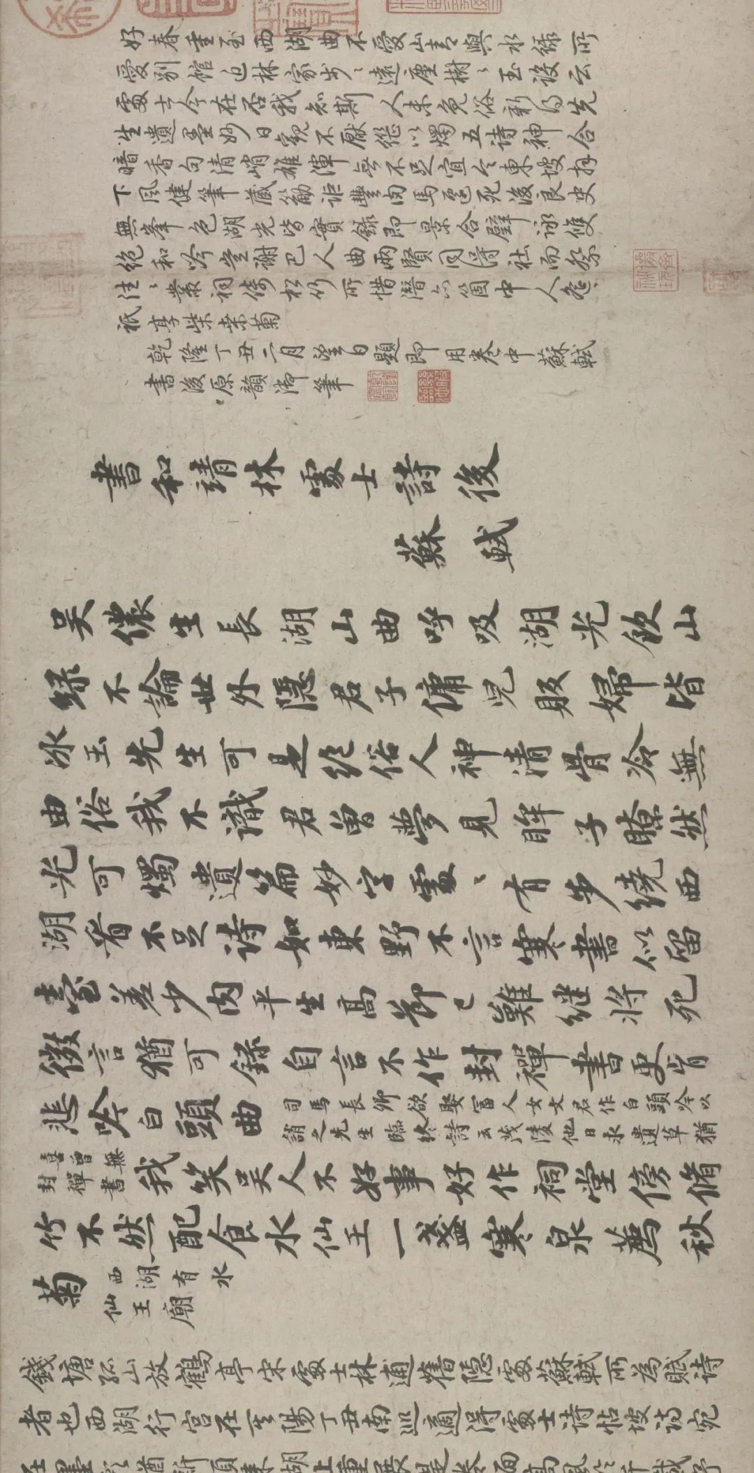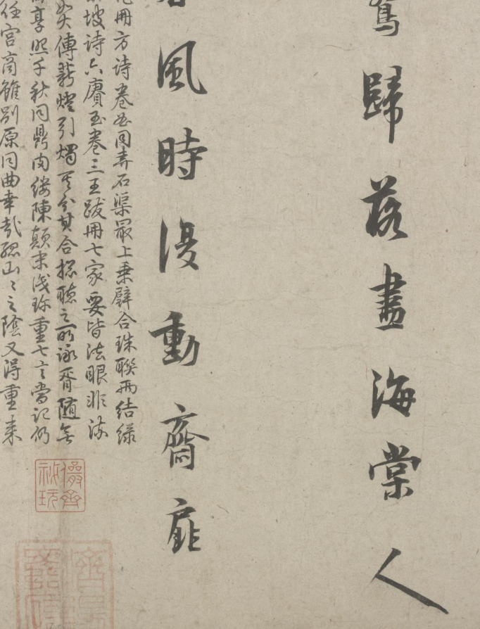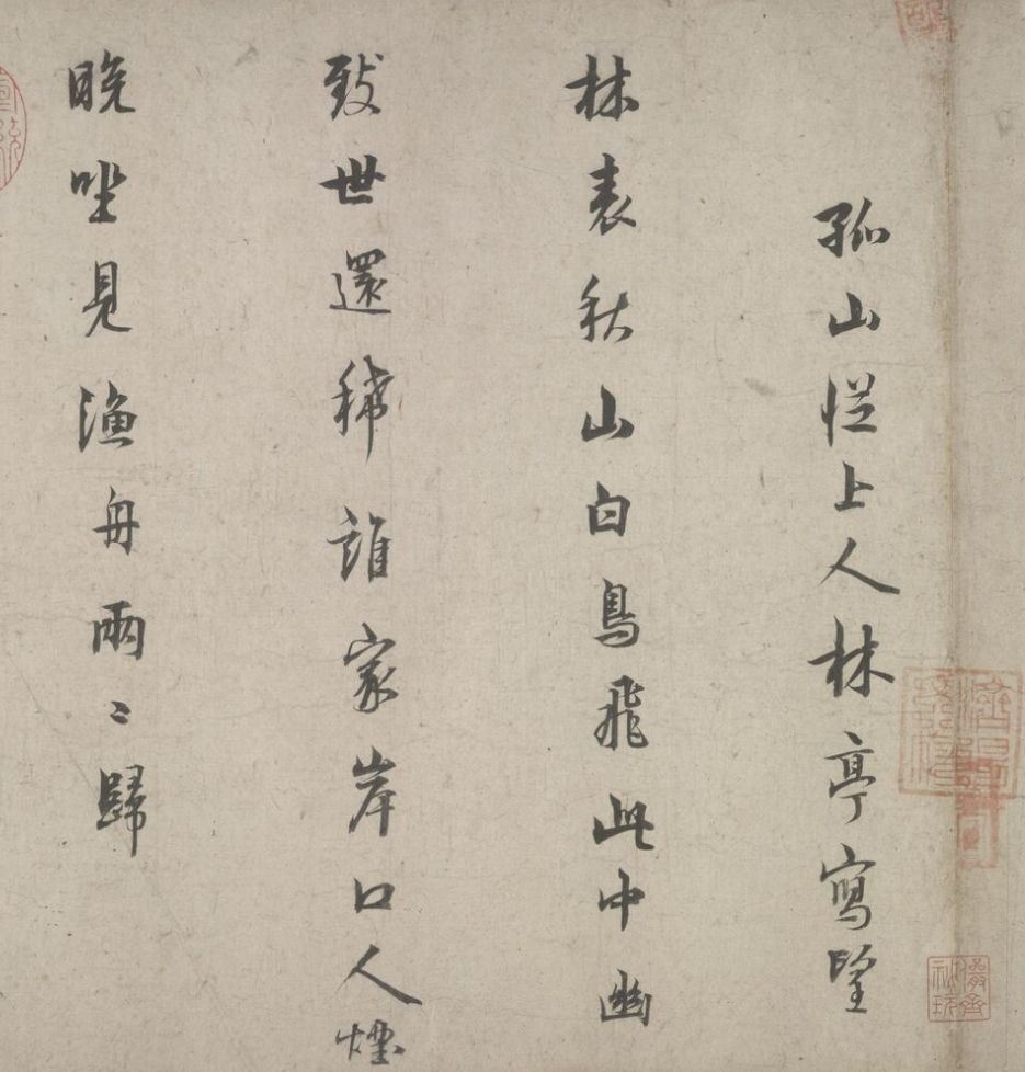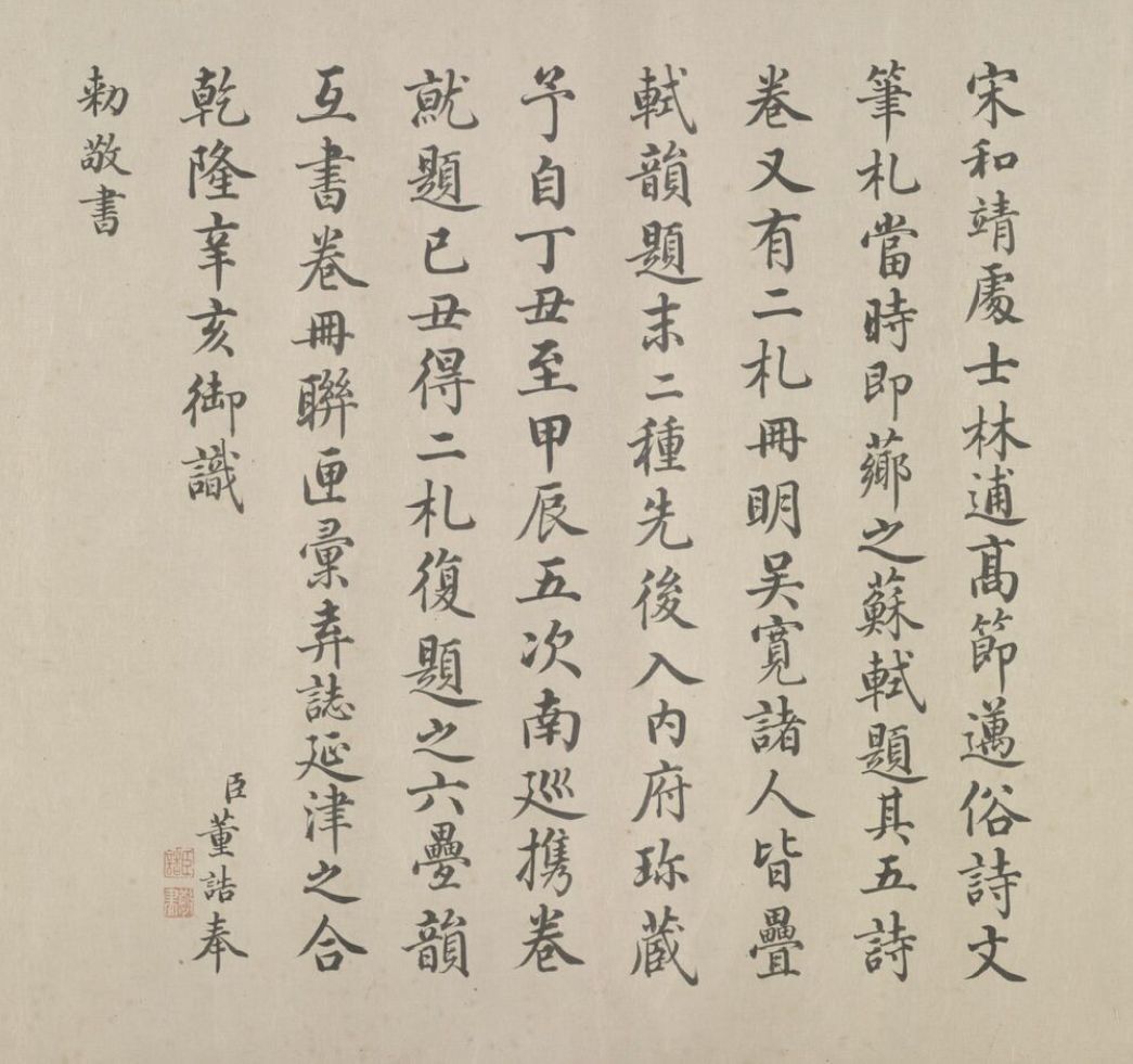 五诗二札逋翁迹,札作册方诗卷曲。同弆石渠最上乘。璧合珠聨两结绿,即今携以随南巡。对景坡诗六赓玉,卷三王(世贞世懋绪)。跋册七家(谢升孙沈周)。(陈颀吴宽东阳张渊程敏政《石渠宝笈》旧蔵林逋诗卷手书七言近体诗五首苏轼长歌极为推许后有王世贞等三跋,又裘曰:修得林逋二札装为一册呈进有谢升孙等诗跋诸人皆元明以来赏鉴家非漫为推许者,逋人品高卓遗墨流传宜加宝护况此卷与册壁合珠聨不期,而会尤为艺林嘉话余自丁丑南巡题句至今甲辰复携以随跸凡六叠苏轼韵中间缕陈巅末以识珍重爱慕盖不啻三致意云)。要皆法眼非流俗,我诗卷册乃并书,如火传薪灯引烛。其分其合总听之,所咏胥随无不足。便使分为各一脔,享照千秋同鼎肉。缕陈颠末识珍重,七言当记仍亲录。林为夷清苏尹任,宫商虽别原同曲。幸哉孤山山之阴,又得重来抚松竹。却惜柴桑未经到,泉明孤醉东篱菊。甲辰暮春月御题,五用苏轼韵。