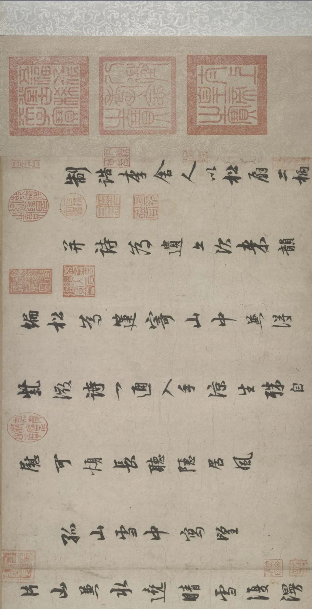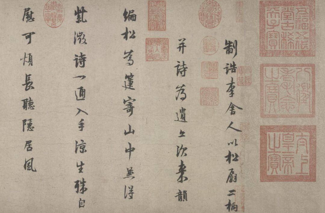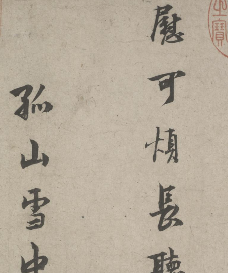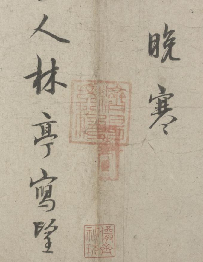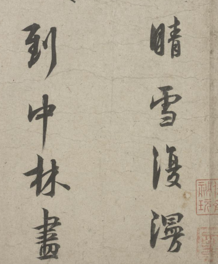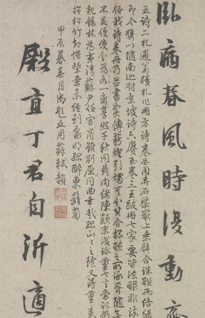 五诗二札逋翁迹,札作册方诗卷曲。同弆石渠最上乘。璧合珠聨两结绿,即今携以随南巡。对景坡诗六赓玉,卷三王(世贞世懋绪)。跋册七家(谢升孙沈周)。(陈颀吴宽东阳张渊程敏政《石渠宝笈》旧蔵林逋诗卷手书七言近体诗五首苏轼长歌极为推许后有王世贞等三跋,又裘曰:修得林逋二札装为一册呈进有谢升孙等诗跋诸人皆元明以来赏鉴家非漫为推许者,逋人品高卓遗墨流传宜加宝护况此卷与册壁合珠聨不期,而会尤为艺林嘉话余自丁丑南巡题句至今甲辰复携以随跸凡六叠苏轼韵中间缕陈巅末以识珍重爱慕盖不啻三致意云)。要皆法眼非流俗,我诗卷册乃并书,如火传薪灯引烛。其分其合总听之,所咏胥随无不足。便使分为各一脔,享照千秋同鼎肉。缕陈颠末识珍重,七言当记仍亲录。林为夷清苏尹任,宫商虽别原同曲。幸哉孤山山之阴,又得重来抚松竹。却惜柴桑未经到,泉明孤醉东篱菊。甲辰暮春月御题,五用苏轼韵。